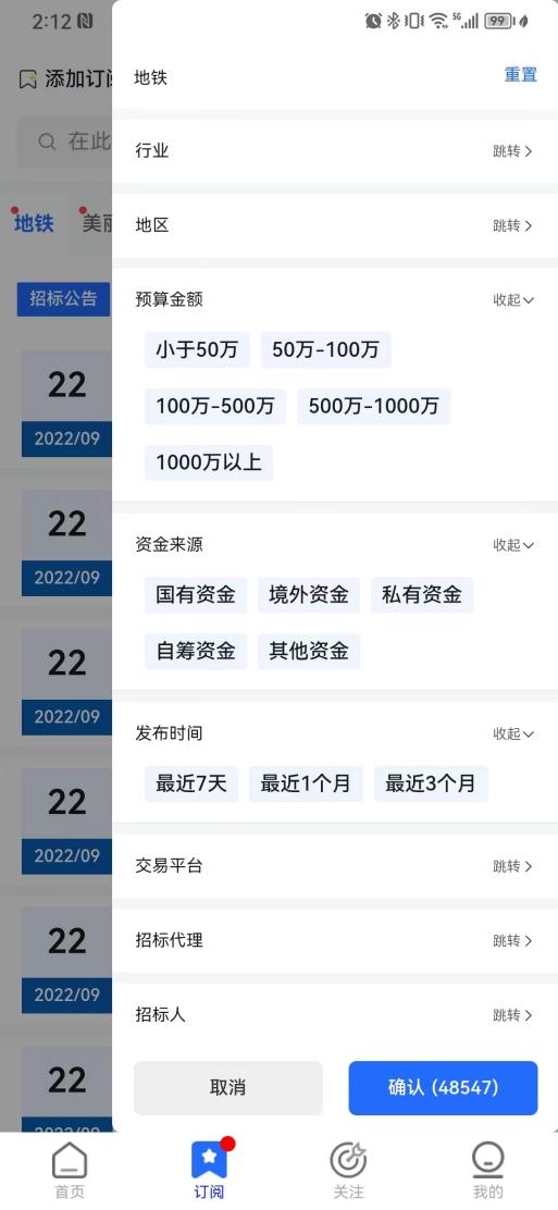 依托高度結構化的數據質量,信息定制服務支持用戶從行業、地區、預算、資金來源、發布時間、交易平臺、招標人、招標代理機構等維度對于標簽訂閱結果二次篩選。