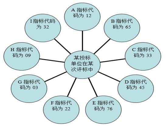 匿名評標可以從規則設定機制上杜絕對招投標過程和結果人為干擾的可能性,利用電子化平臺形成的自動隨機代碼代表不同的投標單位,能夠切實規避人為干擾現象,真正做到公開、公平、公正。杜絕人為干擾是電子化招投標的最重要的優勢之一,只有這樣電子招投標才有強大的生命力,保證了這一點才能發揮其應用的功效。為此,電子評標過程中匿名措施必須做到位,后臺形成的投標單位代碼必須針對每項細分指標都是獨立一一對應的,并由系統隨機生成,條件許可時這些高保密性的操作運行最好由遠程服務器完成。只有這樣才能使任何人都無法通過投標單位的代碼來判別對應的投標單位,評標才能真正成為匿名評標。對單指標進行機評或人工評定后,由電子化平臺自對每項指標進行綜合統計,把每項指標的評分按其代碼劃歸不同的投標單位,這些操作應由電子評標系統后臺自動形成,通過設置嚴密的系統自動運行確保其客觀性和準確性。隨機形成的分指標代碼具有極強的保密性,其示意圖如下: