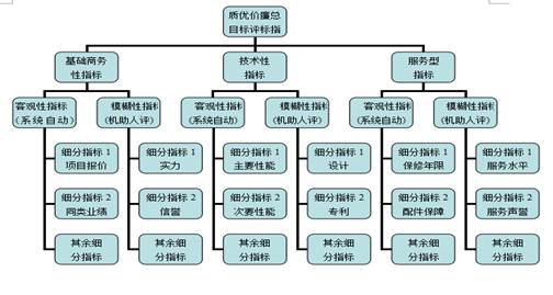 總之,電子化評標中,主要由電子平臺對投標單位進行必要的通過性指標(如企業營業執照、稅務登記證、組織機構代碼證、行業資質證件、無行賄犯罪記錄證明及其他信信譽證等)審核后,對于涉及到需要進一步評分的指標,根據需要分門別類地對評價指標進行細分,盡可能形成一維評價指標以利于準確評標,整個過程中通過技術手段確保匿名評標,從滿足招標項目的要求出發,按照兼顧各方面要素的原則分配合適的權重比,評標指標的分類分解如下圖所示: