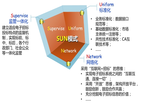 國家招標(biāo)投標(biāo)公共服務(wù)平臺核心建設(shè)思路:通過“SUN”模式,在全國范圍內(nèi)推動(dòng)建立起由交易平臺、公共服務(wù)平臺、行政監(jiān)督平臺構(gòu)成,分類清晰、功能互補(bǔ)、互聯(lián)互通的電子招標(biāo)投標(biāo)系統(tǒng),從而促進(jìn)‘公開、公平、公正、誠實(shí)信用’的市場環(huán)境。